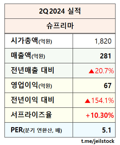※ 슈프리마가 2분기 호실적을 발표했습니다. 슈프리마는 2분기와 4분기가 실적이 좋은 계절성을 갖기 때문에 전분기(1분기)와 비교하기보단 작년 동기 대비(YoY) 얼마나 좋아졌는지를 보면 됩니다. YoY로 매출액은 +21%, 영업이익은 +154% 증가한 좋은 실적입니다. 슈프리마 실적은 대부분이 수출인데(1분기 기준 수출 비중 83%), 특히 북미 지역에 국내 반도체/배터리/자동차 대기업들이 공장을 잇따라 지으면서 이에 따라 보안시스템 실적이 크게 증가한 것으로 보고 있습니다. 여기에 3분기 중으로 영상보안 솔루션(S/W) 기업을 인수할 것으로 예상되고 있습니다. 이 경우 기존에 미진출 영역이던 영상분석 알고리즘, 자율주행, 로봇 등으로 사업영역이 확대되면서 실적과 주가에 추가 모멘텀으로 작용할 수 있습니다. 보유 중인 현금성 자산(약 1600억원)이 시가총액(약 1800억원)의 80%가 넘을 정도로 막대한 유보현금이 있기 때문에 M&A 이후 하반기에 주주환원정책도 기대해볼 수 있습니다. 2분기 이후 본격적인 주가 리레이팅을 기대해봅니다.