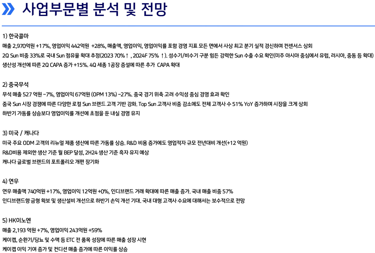 ※ 아래는 한국콜마 IR 자료 중 사업 내용에 관한 부분을 가져온 것인데요. 중국을 제외하면 모든 사업부가 좋았습니다. 노화 방지를 위한 선케어 중요성이 부각되면서 선케어 매출의 계절성이 희석되고 있고, 화장품 용기 자회사 연우는 국내 대형 뷰티 브랜드사(중국 비중이 높고, 제품 가성비는 낮은) 비중보다 중소형 인디 뷰티 브랜드(중국 비중 낮고, 제품 가성비 높고, 트렌디한) 비중을 높이는 쪽으로 대응을 계속 해나가며 글로벌 K-뷰티 메가 트렌드에 제대로된 방향으로 탑승하고 있습니다.