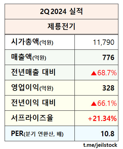 시간외 일부 전력설비 테마 상승. 장 마감 후 2분기 실적 발표, 매출액 776억원(전년동기대비 +68.7%), 영업이익 328억원(전년동기대비 +66.1%)