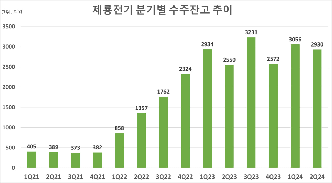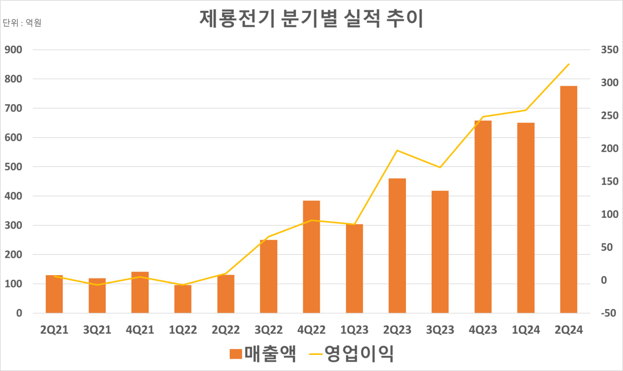 ※ 투뿔(1++) 추천주 중 가장 많이 추천한 효자 종목 제룡전기가 2분기에도 역시 실망시키지 않는 호실적을 발표했습니다. 분기 기준 역대 최대 실적을 달성했고, 2분기말 기준 수주잔고가 2930억원으로 여전히 풍부해 당분간 호실적이 계속될 것으로 전망됩니다. 전체 매출 중 수출 비중이 2022년 56% → 2023년 82% → 2024년 2분기 92%로 급격하게 증가하고 있습니다. 미국 노후 전력망 교체, 신재생에너지 인프라 확대에 더해 최근 인공지능(AI) 산업 개화로 데이터센터 전력 수요가 폭증하면서 이에 따른 수혜가 계속되고 있는 것으로 파악됩니다. 8월 7일 리서치 이야기(https://hibulls.com/?page_id=48582&uid=132&mod=document&pageid=1)에서 전력기기 섹터 내 top-pick을 HD현대일렉트릭, 제룡전기, 일진전기로 보고 있다고 말씀드렸습니다.