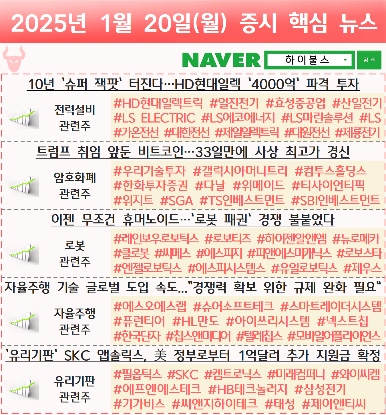 전력설비 관련주, 암호화폐 관련주, 로봇 관련주, 자율주행 관련주, 유리기판 관련주 글 내비게이션 [01.17] 증시 개장 전 핵심뉴스 하이불스 Pick [01.21] 증시 개장 전 핵심뉴스 하이불스 Pick