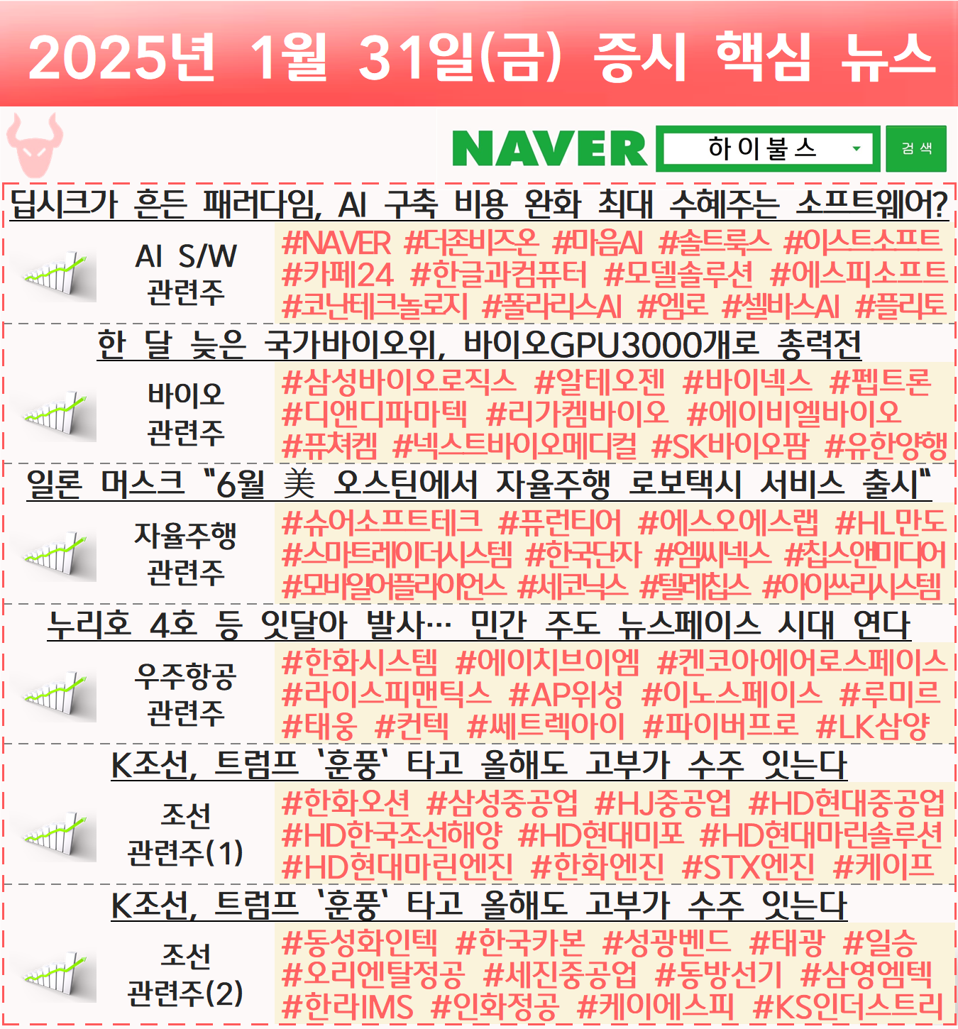 AI S/W 관련주, AI 소프트웨어 관련주, 바이오 관련주, 자율주행 관련주, FSD 관련주, 우주 관련주, 우주항공 관련주, 조선 관련주 글 내비게이션 [01.24] 증시 개장 전 핵심뉴스 하이불스 Pick [02.03] 증시 개장 전 핵심뉴스 하이불스 Pick