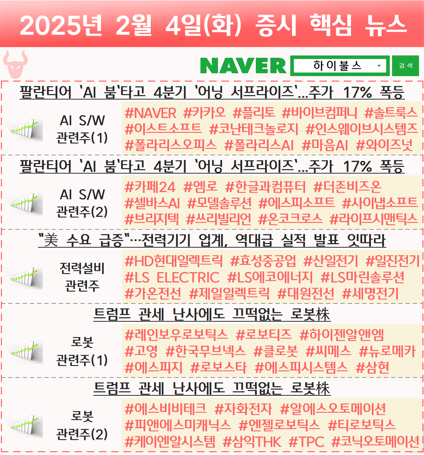 AI S/W 관련주, AI 소프트웨어 관련주, 전력설비 관련주, 전력기기 관련주, 전력망 관련주, 로봇 관련주 글 내비게이션 [02.03] 증시 개장 전 핵심뉴스 하이불스 Pick [02.05] 증시 개장 전 핵심뉴스 하이불스 Pick