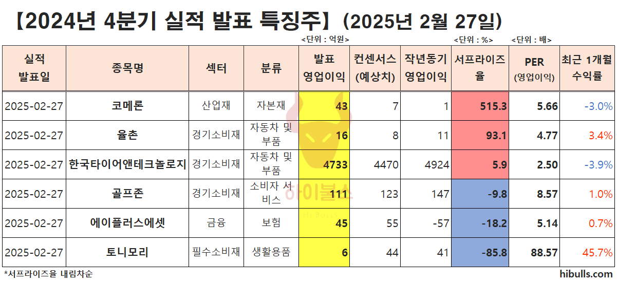 실적 서프라이즈 : 코메론, 율촌 실적 부합 : 한국타이어앤테크놀로지, 골프존 실적 쇼크 : 에이플러스에셋, 토니모리 글 내비게이션 [02.28] 증시 개장 전 시황&오늘의 대응 전략 [02.28] 종목별 증권사 투자의견 요약