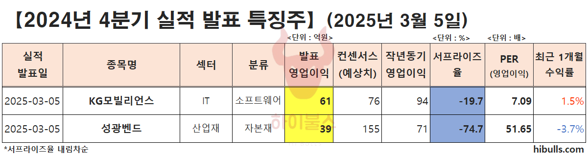 실적 쇼크 : KG모빌리언스, 성광벤드
