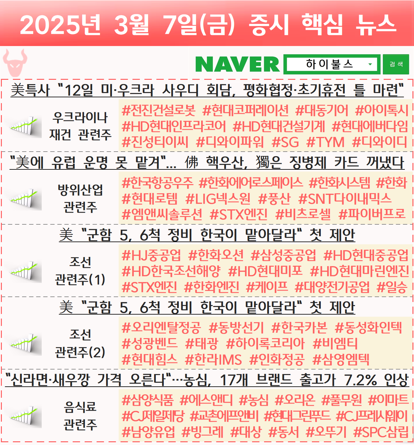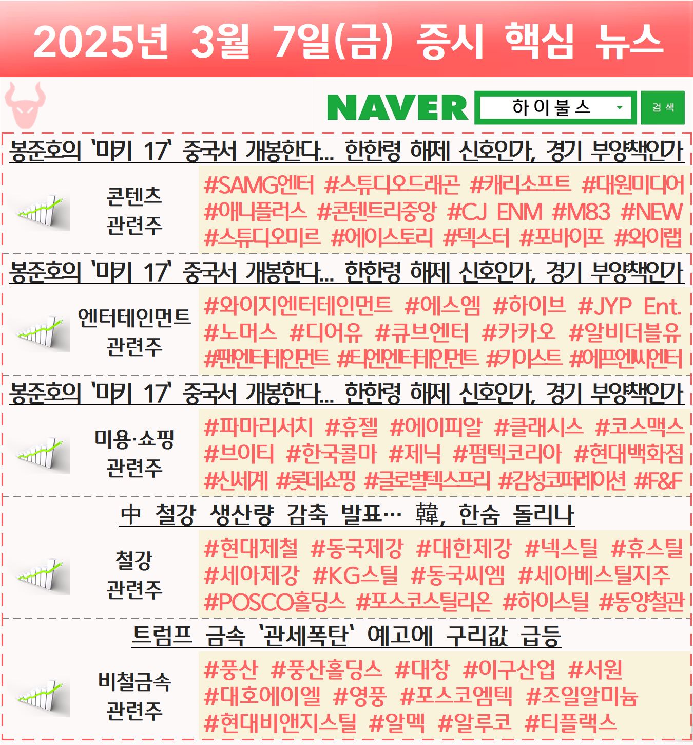 콘텐츠 관련주, K-콘텐츠 관련주, 엔터테인먼트 관련주, 미용 관련주, 쇼핑 관련주, 한한령 해제 관련주, 철강 관련주, 비철금속 관련주, 구리 관련주, 우크라이나 재건 관련주, 우크라이나 종전 관련주, 우크라 재건 관련주, 우크라 종전 관련주, 방위산업 관련주, 방산 관련주, 방산주, 조선주, 조선 관련주, 음식료 관련주