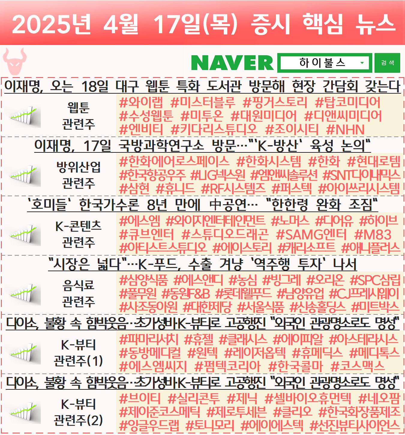 웹툰 관련주, 방위산업 관련주, K-콘텐츠 관련주, K콘텐츠 관련주, 콘텐츠 관련주, 음식료 관련주, K-푸드 관련주, K푸드 관련주, K-뷰티 관련주, K뷰티 관련주, 미용기기 관련주, 화장품 관련주