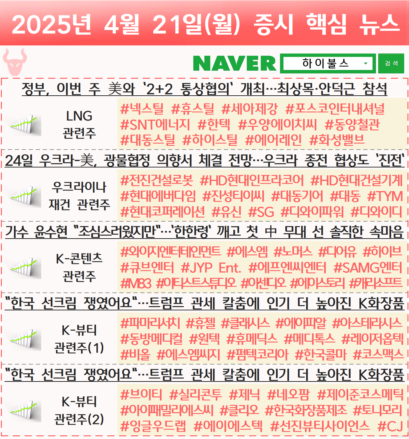 LNG 관련주, 시추 관련주, 우크라이나 재건 관련주, 우크라이나 종전 관련주, K-콘텐츠 관련주, 엔터테인먼트 관련주, K-뷰티 관련주, K뷰티 관련주, 화장품 관련주, 미용기기 관련주