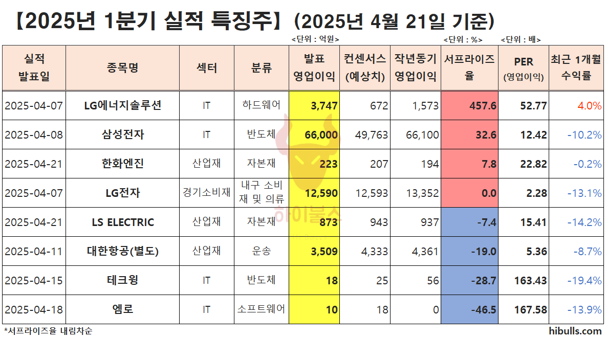 어닝 서프라이즈 : LG에너지솔루션, 삼성전자 어닝 부합 : 한화엔진, LG전자, LS ELECTRIC 어닝 쇼크 : 대한항공, 테크윙, 엠로 글 내비게이션 [04.22] 증시 개장 전 시황&오늘의 대응 전략 [04.22] 종목별 증권사 투자의견 요약