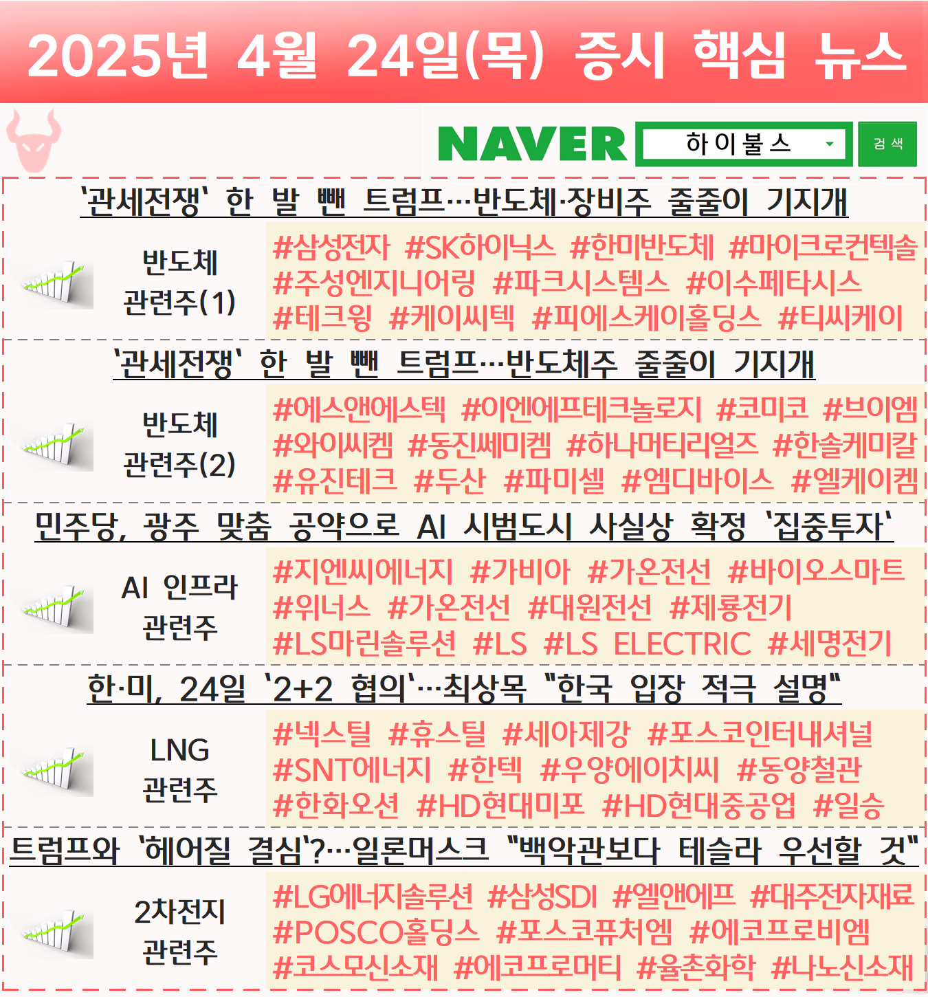반도체 관련주, AI 인프라 관련주, AI 데이터센터 관련주, LNG 관련주, 시추 관련주, 2차전지 관련주 글 내비게이션 [04.23] 증시 개장 전 핵심뉴스 하이불스 Pick [04.25] 증시 개장 전 핵심뉴스 하이불스 Pick