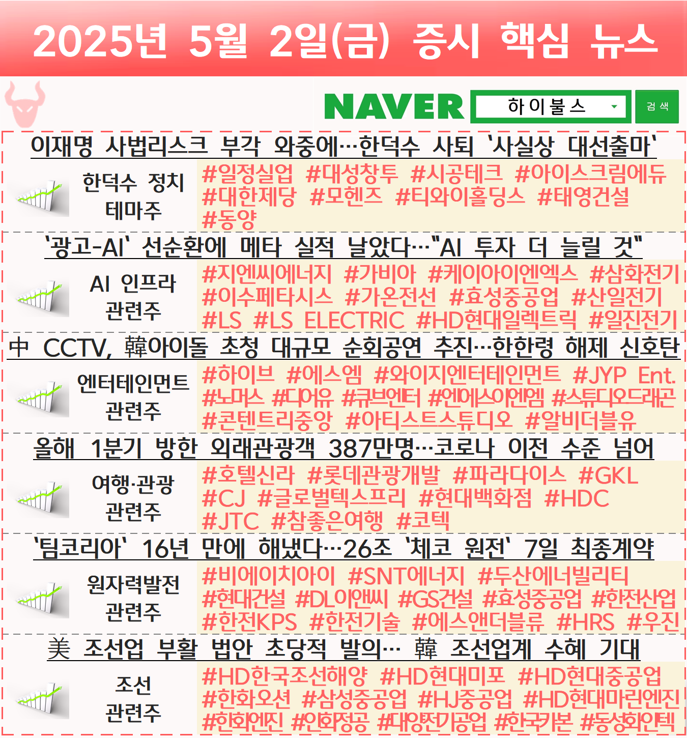한덕수 관련주, 한덕수 테마주, 한덕수 정치테마주, 한덕수 정치 테마주, AI 관련주, AI 인프라 관련주, 데이터센터 관련주, 엔터테인먼트 관련주, 한한령 해제 관련주, 한한령 해제 수혜주, 여행 관련주, 관광 관련주, 원전 관련주, 원전주, 원자력발전 관련주, 조선 관련주, 조선주