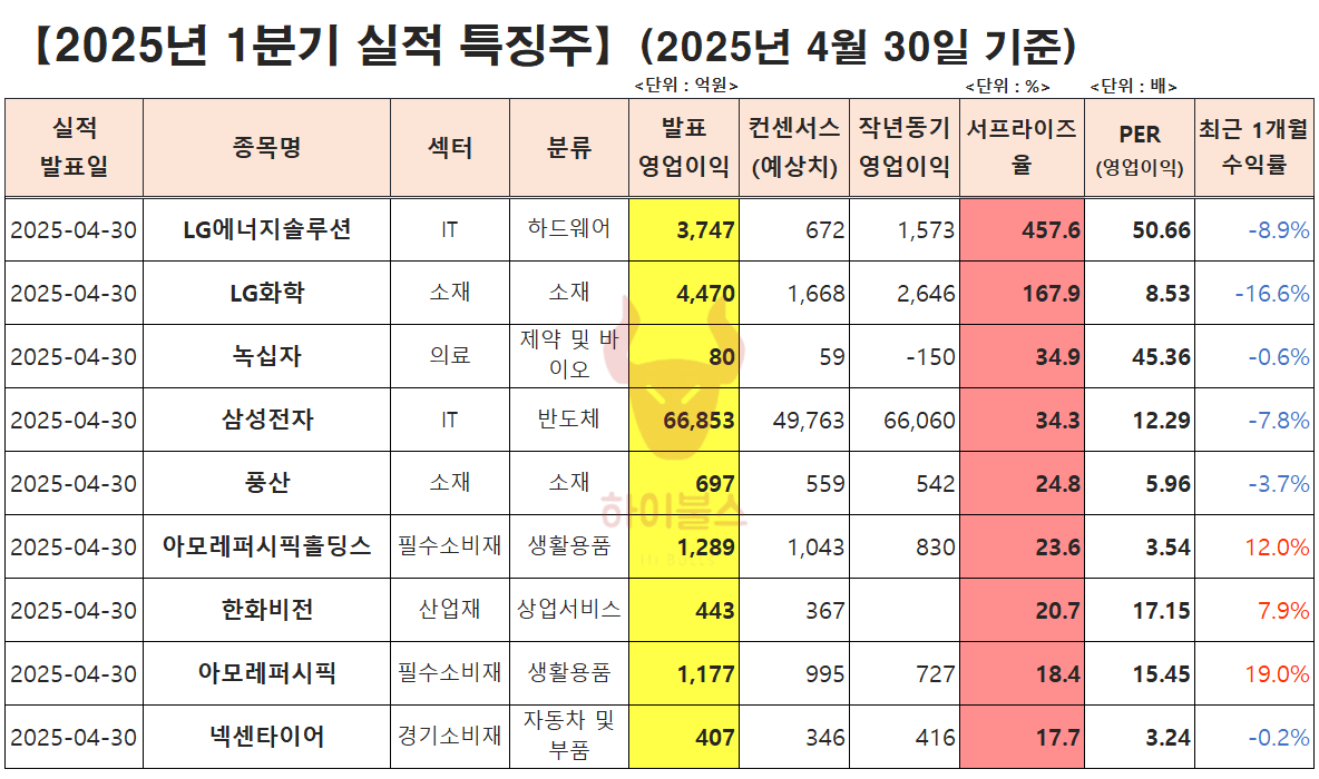 실적 서프라이즈 : LG에너지솔루션, LG화학, 녹십자, 삼성전자, 풍산, 아모레퍼시픽홀딩스, 한화비전, 아모레퍼시픽, 넥센타이어, 제이에스코퍼레이션, 키움증권, 한화에어로스페이스, LX인터내셔널