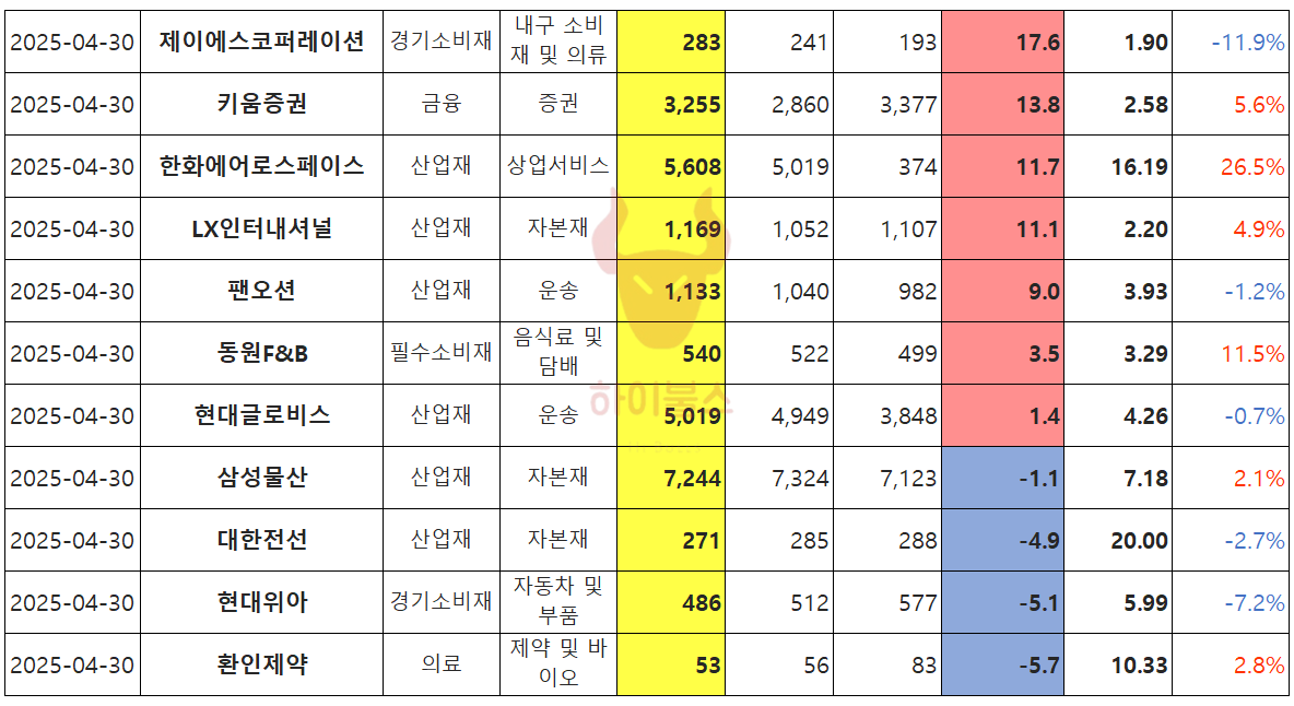 실적 부합 : 팬오션, 동원F&B, 현대글로비스, 삼성물산, 대한전선, 현대위아, 환인제약