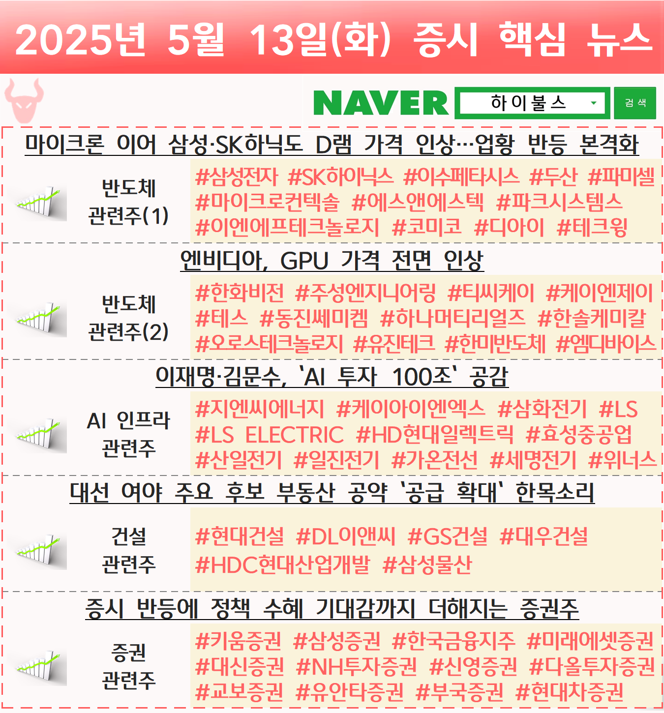 반도체 관련주, AI 인프라 관련주, 데이터센터 관련주, 건설 관련주, 증권 관련주, 증권주, 건설주, 반도체주 글 내비게이션 [05.12] 증시 개장 전 핵심뉴스 하이불스 Pick [05.14] 증시 개장 전 핵심뉴스 하이불스 Pick