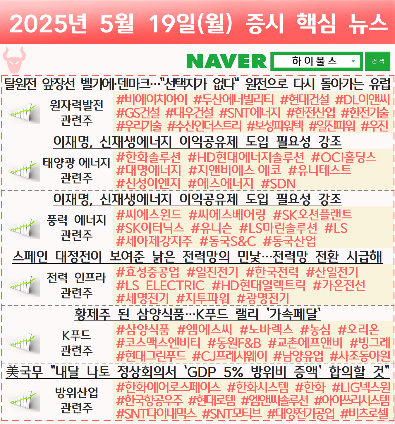 원전 관련주, 원자력발전 관련주, 태양광 관련주, 풍력 관련주, 전력설비 관련주, 전력망 관련주, 전력 인프라 관련주, 전력기기 관련주, 변압기 관련주, 전선 관련주, K푸드 관련주, K-푸드 관련주, 음식료 관련주, 방산주, 방산 관련주, 방위산업 관련주