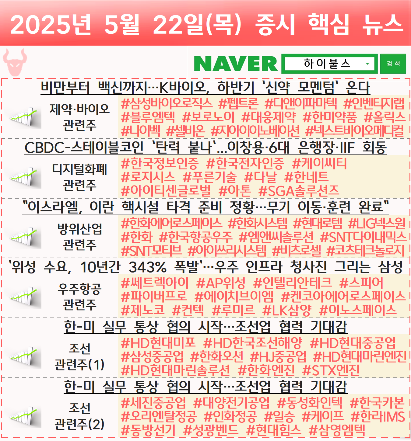 제약 바이오 관련주, 디지털화폐 관련주, CBDC 관련주, 스테이블코인 관련주, 방위산업 관련주, 방산 관련주, 우주항공 관련주, 우주 관련주, 조선 관련주, 방산주, 조선주 글 내비게이션 [05.21] 증시 개장 전 핵심뉴스 하이불스 Pick [05.23] 증시 개장 전 핵심뉴스 하이불스 Pick