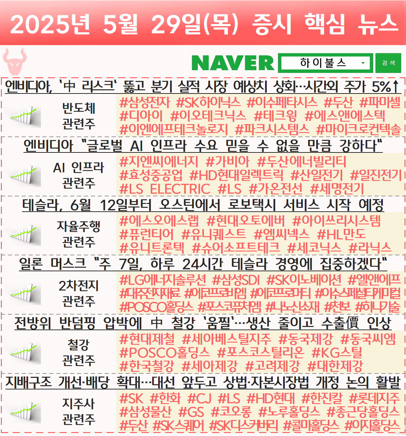 반도체 관련주, HBM 관련주, AI 관련주, AI 인프라 관련주, 자율주행 관련주, 2차전지 관련주, 철강 관련주, 지주사 관련주 글 내비게이션 [05.28] 증시 개장 전 핵심뉴스 하이불스 Pick [05.30] 증시 개장 전 핵심뉴스 하이불스 Pick