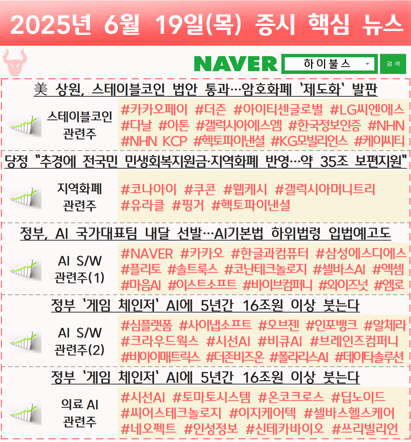 스테이블코인 관련주, 지역화폐 관련주, AI 소프트웨어 관련주, AI S/W 관련주, 의료AI 관련주 글 내비게이션 [06.18] 증시 개장 전 핵심뉴스 하이불스 Pick [06.20] 증시 개장 전 핵심뉴스 하이불스 Pick