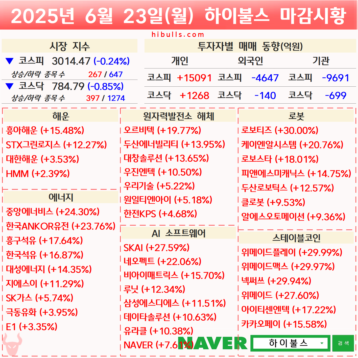 [06.23] 증시 마감시황 및 오늘의 특징주/특징섹터