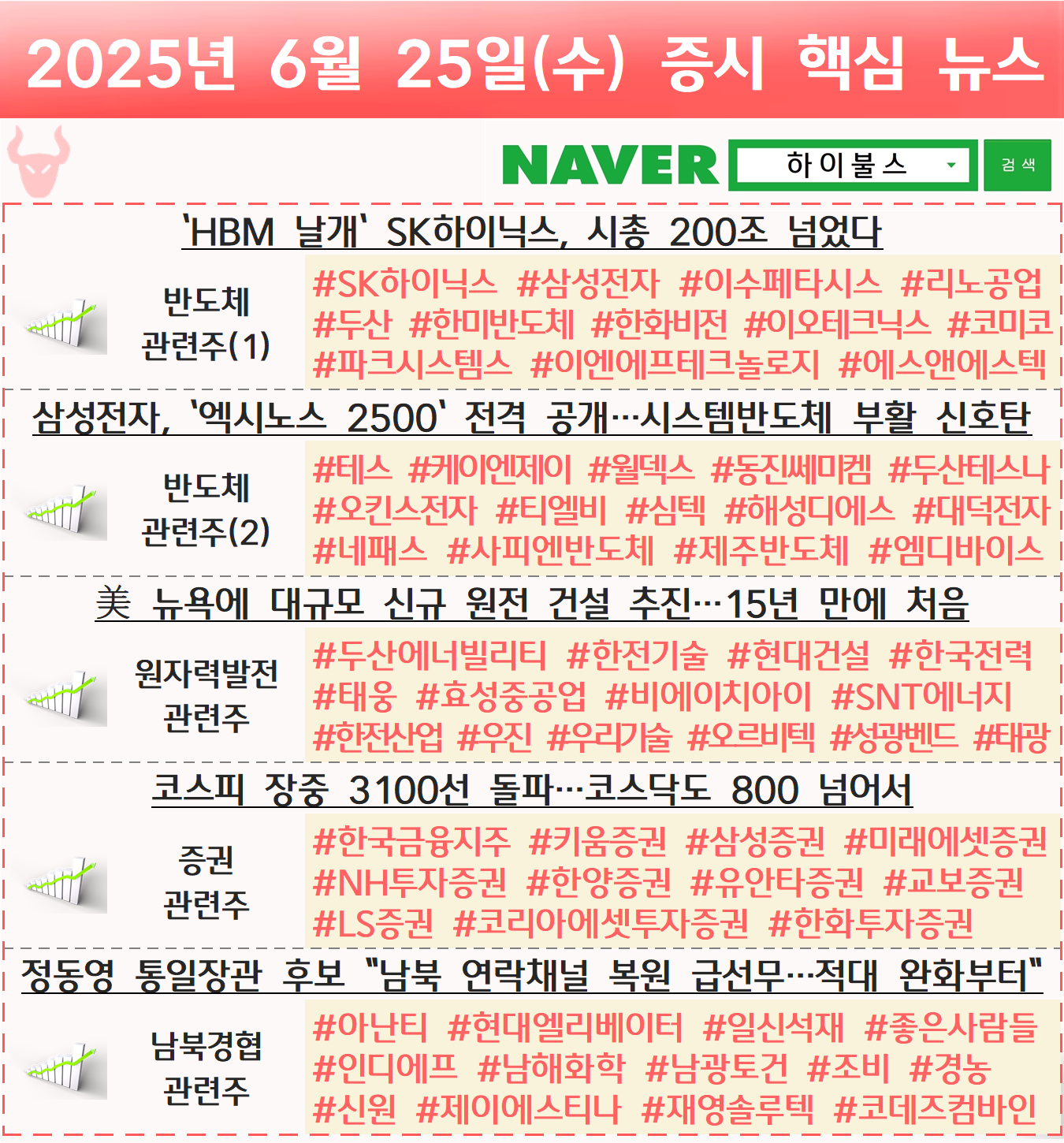 반도체 관련주, 원전 관련주, 원자력발전 관련주, 원자력 에너지 관련주, 증권 관련주, 남북경협 관련주 글 내비게이션 [06.24] 증시 개장 전 핵심뉴스 하이불스 Pick [06.26] 증시 개장 전 핵심뉴스 하이불스 Pick