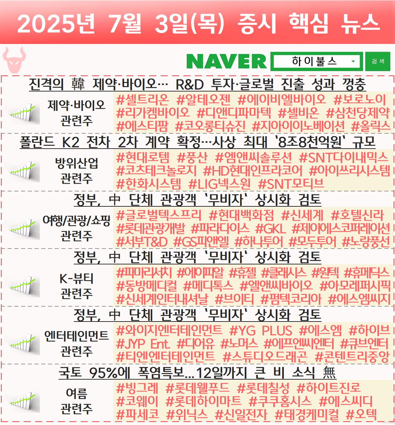 제약 바이오 관련주, 방위산업 관련주, 방산 관련주, K2 관련주, 여행 관련주, 관광 관련주, 쇼핑 관련주, 한한령 관련주, 한한령 해제 관련주, K뷰티 관련주, K-뷰티 관련주, 엔터테인먼트 관련주, 여름 관련주, 폭염 관련주