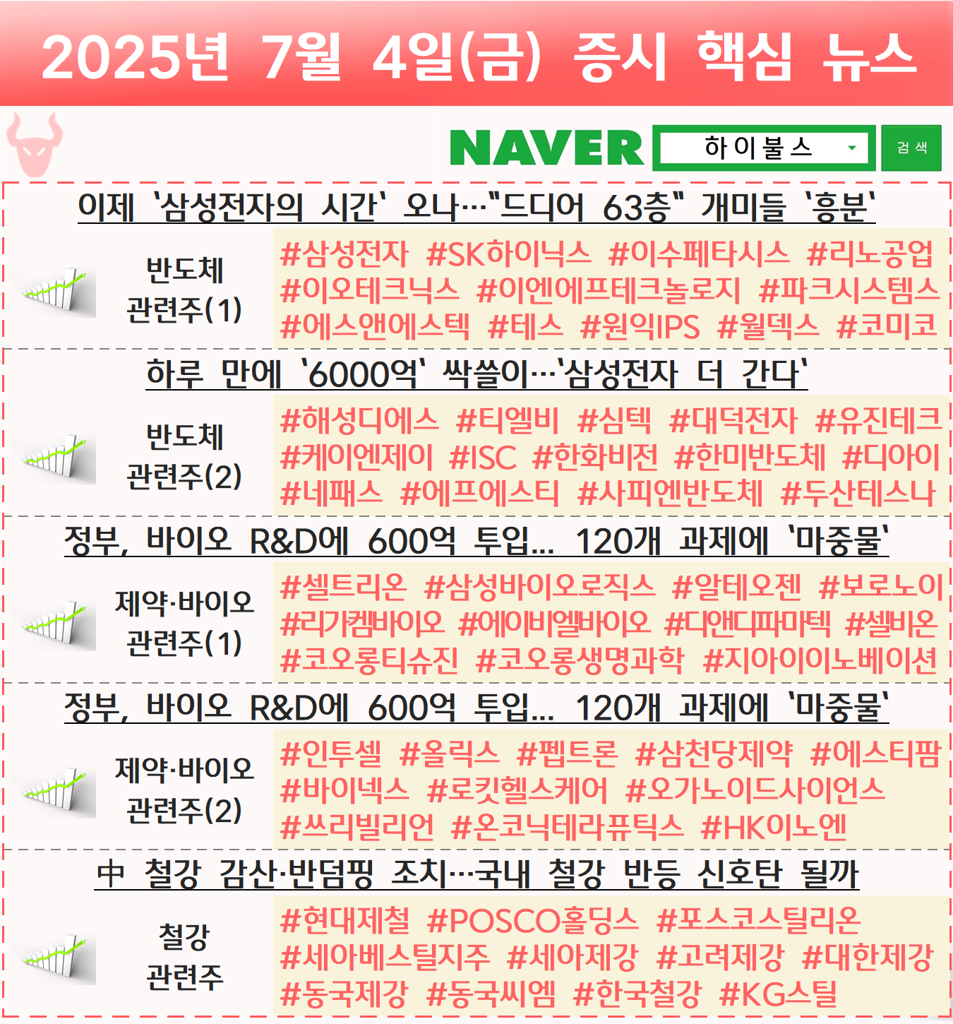 반도체 관련주, 삼성전자 관련주, 제약 관련주, 바이오 관련주, 제약바이오 관련주, 철강 관련주 글 내비게이션 [07.03] 증시 개장 전 핵심뉴스 하이불스 Pick [07.07] 증시 개장 전 핵심뉴스 하이불스 Pick