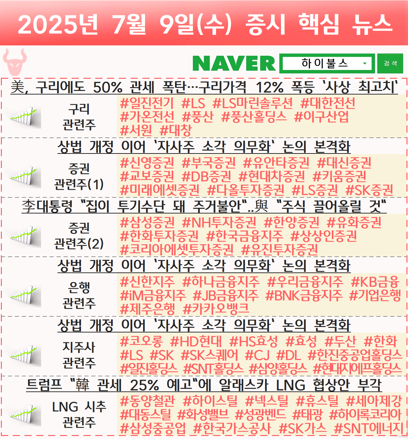 구리 관련주, 증권 관련주, 은행 관련주, 지주사 관련주, 상법 개정 관련주, LNG 관련주, 알래스카 LNG 관련주, 시추 관련주 글 내비게이션 [07.08] 증시 개장 전 핵심뉴스 하이불스 Pick [07.10] 증시 개장 전 핵심뉴스 하이불스 Pick