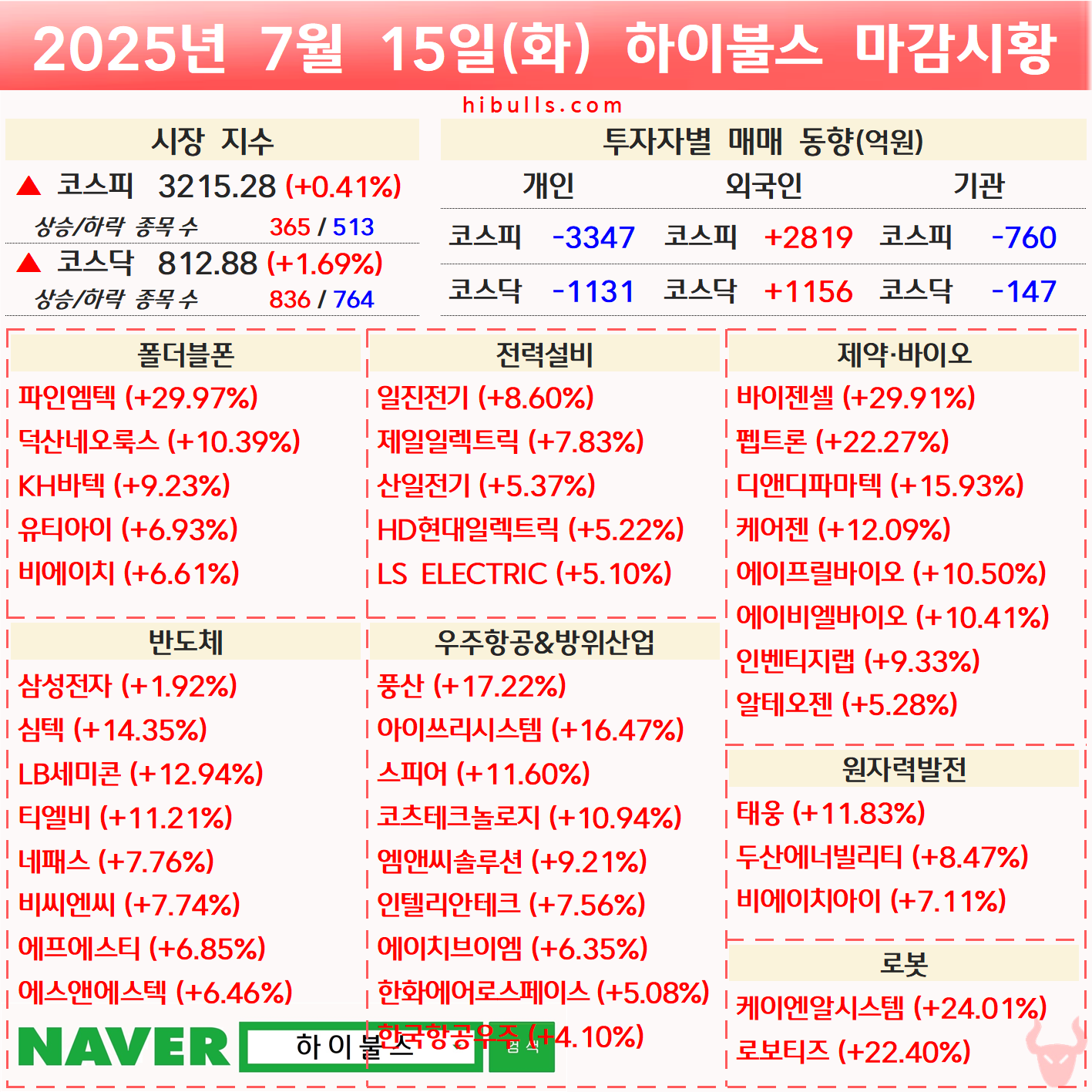 [07.15] 증시 마감시황 및 오늘의 특징주/특징섹터