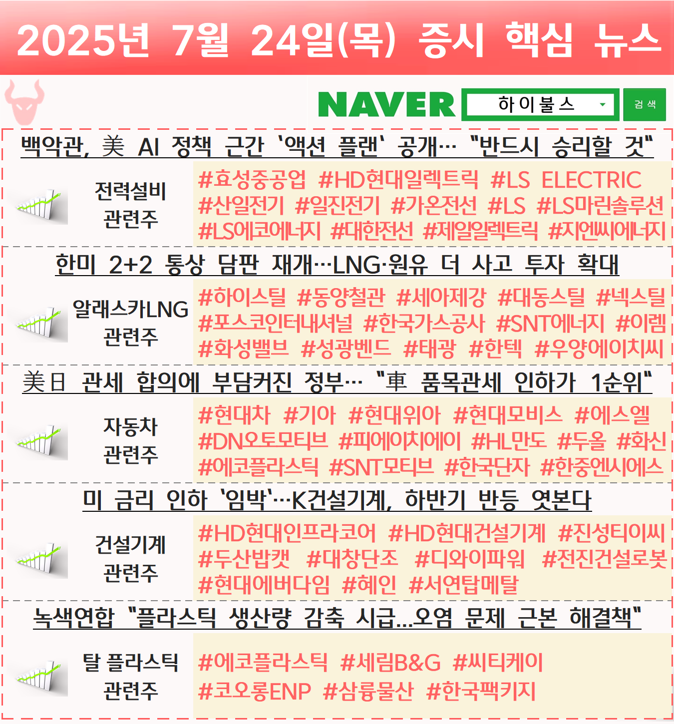 전력설비 관련주, 전력망 관련주, AI 인프라 관련주, 전력인프라 관련주, 전력기기 관련주, 변압기 관련주, LNG 관련주, 시추 관련주, 알래스카LNG 관련주, 자동차 관련주, 건설기계 관련주, 건설장비 관련주, 탈플라스틱 관련주, 탈 플라스틱 관련주