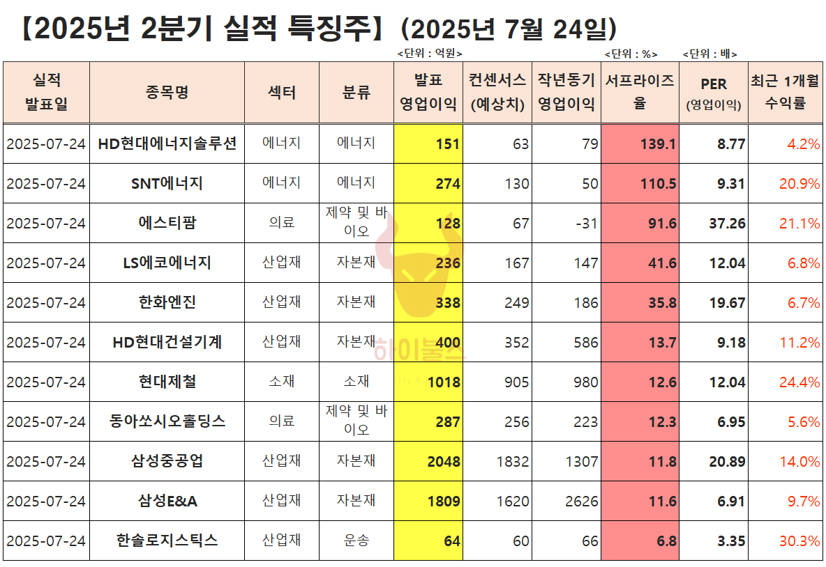 실적 서프라이즈 : HD현대에너지솔루션, SNT에너지, 에스티팜, LS에코에너지, 한화엔진