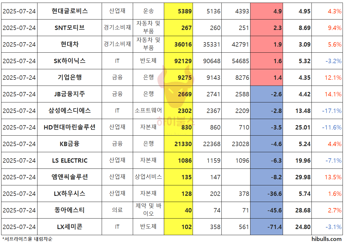 실적 부합 : 한솔로지스틱스, 현대글로비스, SNT모티브, 현대차, SK하이닉스, 기업은행, JB금융지주, 삼성에스디에스, HD현대마린솔루션, KB금융, LS ELECTRIC, 엠앤씨솔루션