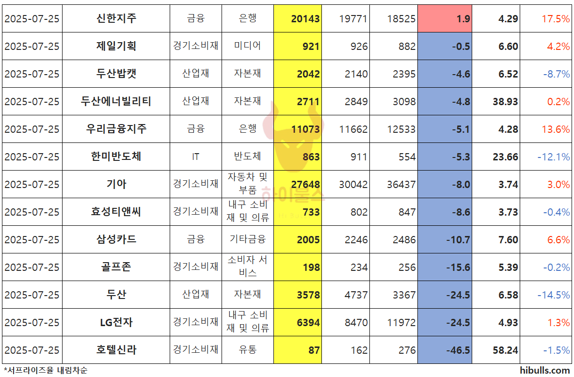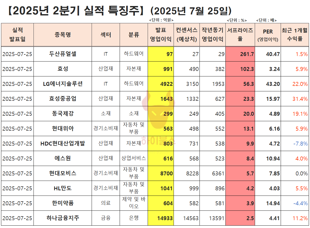 실적 부합 : HDC현대산업개발, 에스원, 현대모비스, HL만도, 한미약품, 하나금융지주, 신한지주, 제일기획, 두산밥캣, 두산에너빌리티, 우리금융지주, 한미반도체, 기아, 효성티앤씨