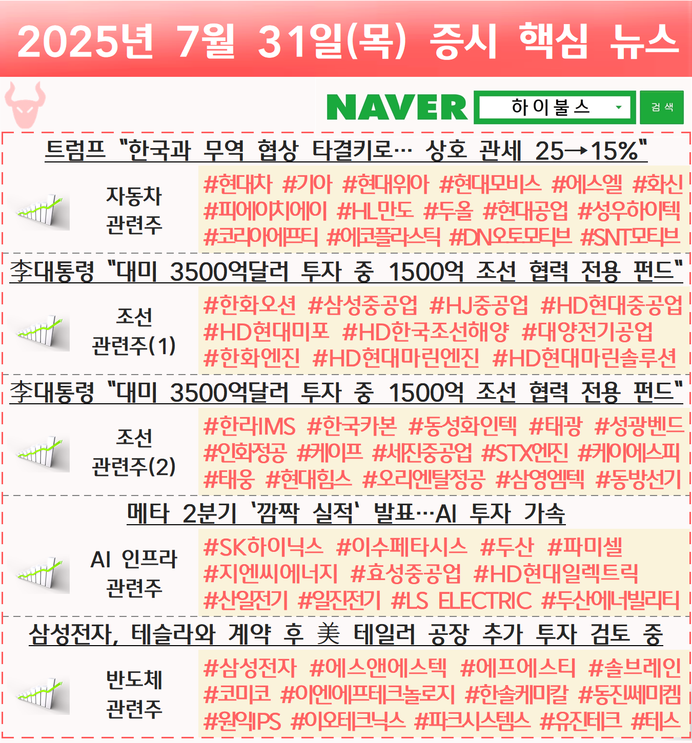 자동차 관련주, 조선 관련주, AI 관련주, AI 인프라 관련주, 반도체 관련주 글 내비게이션 [07.30] 증시 개장 전 핵심뉴스 하이불스 Pick [08.01] 증시 개장 전 핵심뉴스 하이불스 Pick