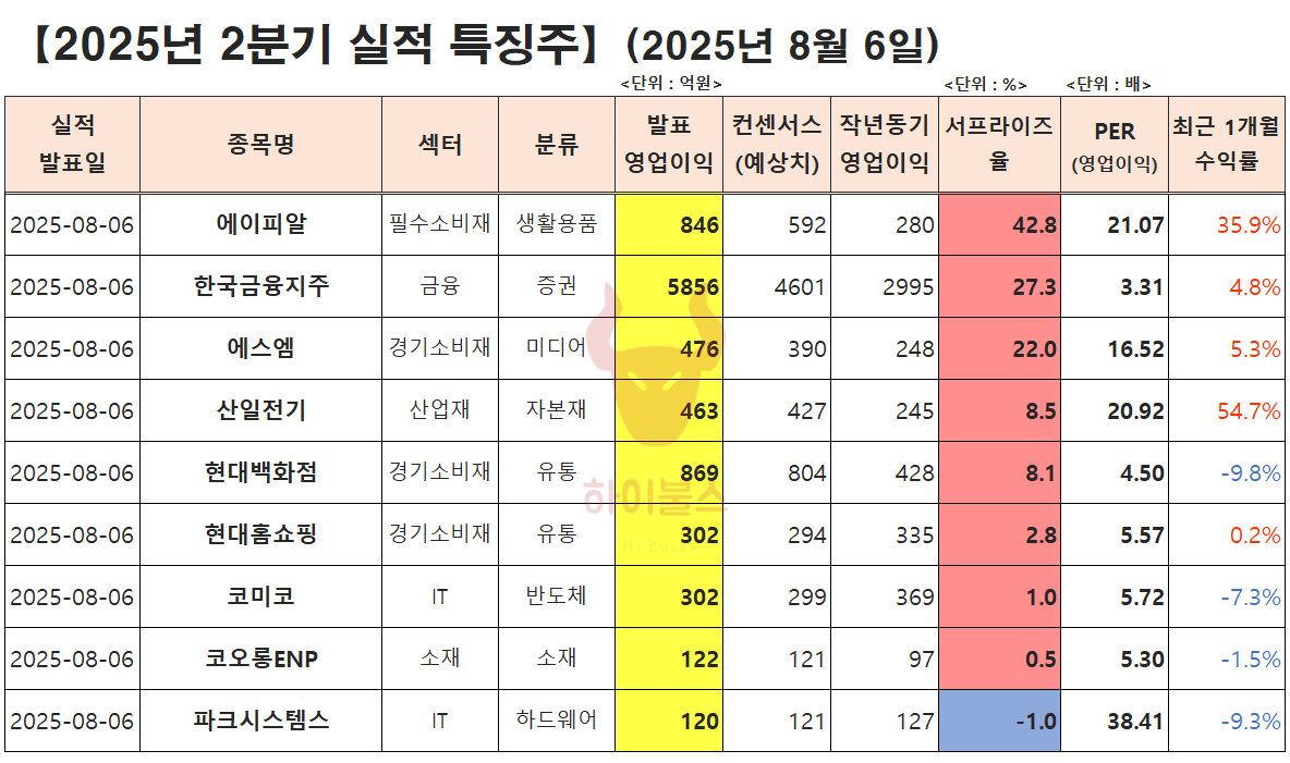 실적 서프라이즈 : 에이피알, 한국금융지주, 에스엠