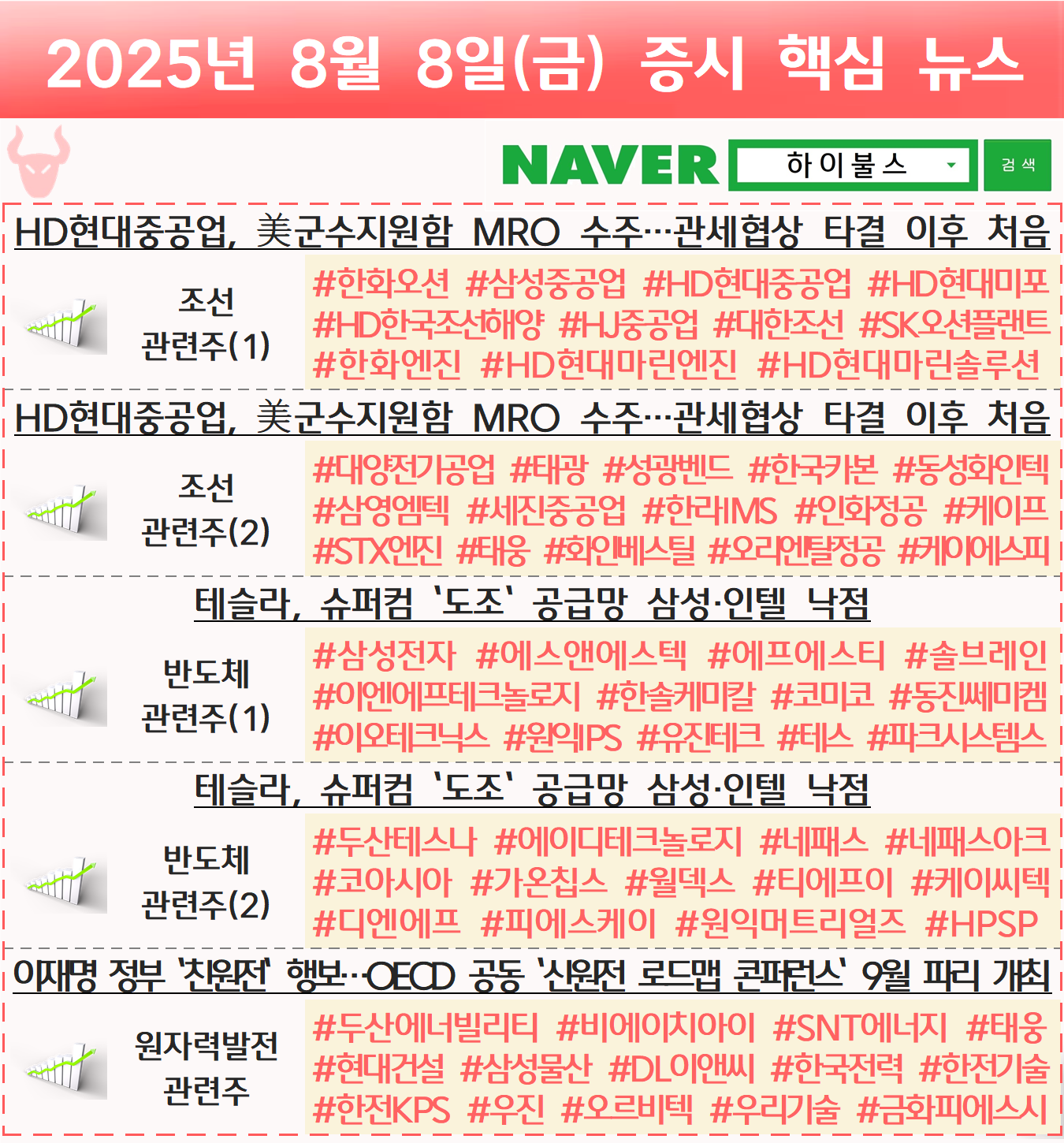 조선 관련주, 반도체 관련주, 원전 관련주, 원자력발전 관련주, 원자력 관련주, 원자력 에너지 관련주 글 내비게이션 [08.07] 증시 개장 전 핵심뉴스 하이불스 Pick [08.11] 증시 개장 전 핵심뉴스 하이불스 Pick