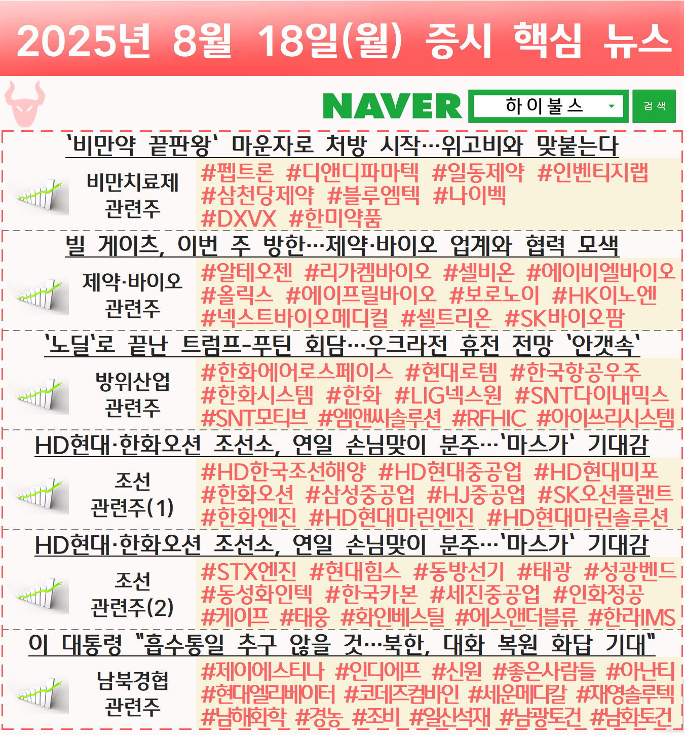 비만치료제 관련주, 비만 관련주, 비만 치료제 관련주, 바이오 관련주, 제약 관련주, 방산 관련주, 방위산업 관련주, 조선 관련주, 남북경협 관련주, 북한 관련주 글 내비게이션 [08.14] 증시 개장 전 핵심뉴스 하이불스 Pick [08.19] 증시 개장 전 핵심뉴스 하이불스 Pick