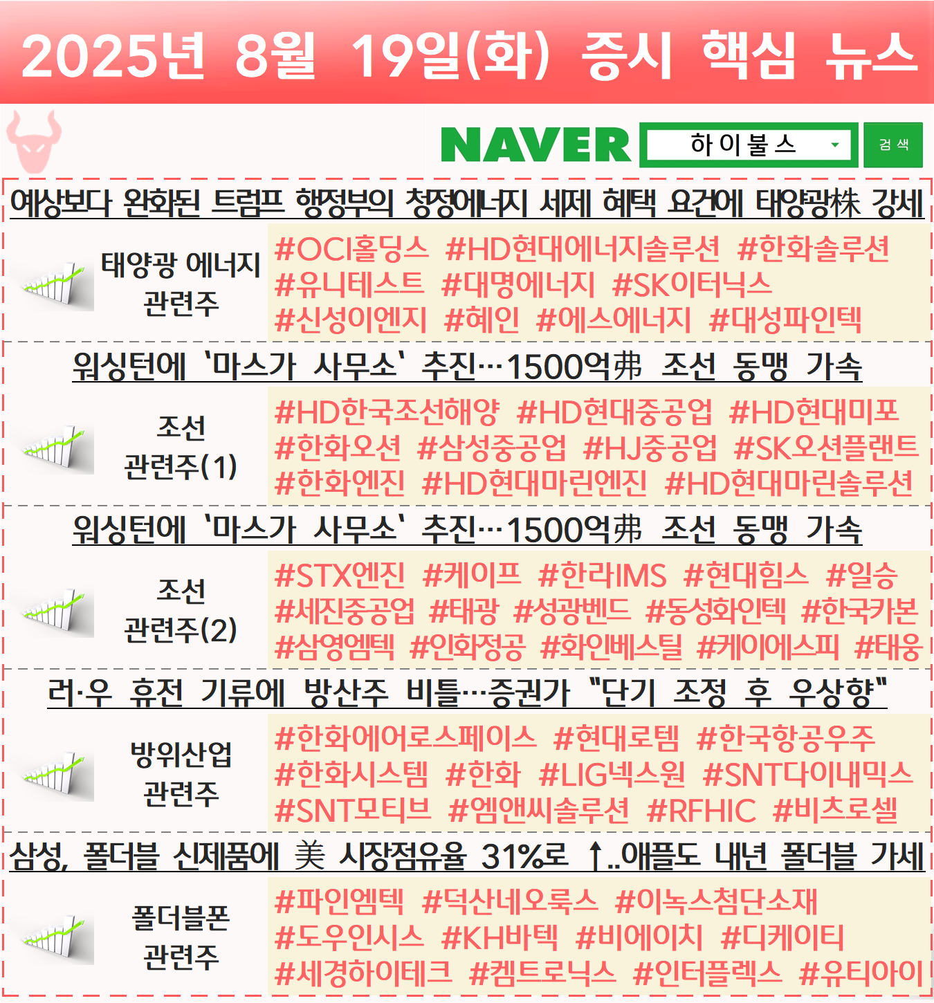 태양광 관련주, 태양광 에너지 관련주, 조선 관련주, 방위산업 관련주, 방산 관련주, 폴더블 관련주, 폴더블폰 관련주 글 내비게이션 [08.18] 증시 개장 전 핵심뉴스 하이불스 Pick [08.20] 증시 개장 전 핵심뉴스 하이불스 Pick
