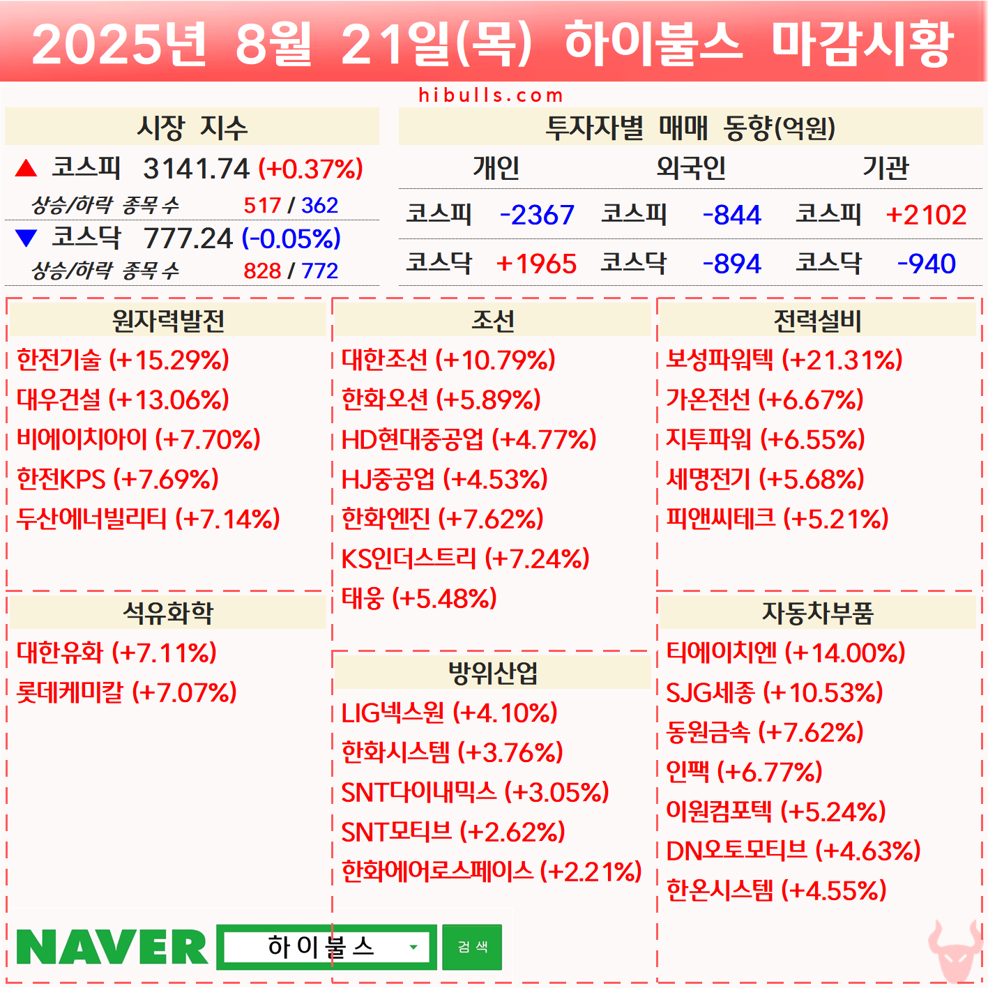 [08.21] 증시 마감시황 및 오늘의 특징주/특징섹터