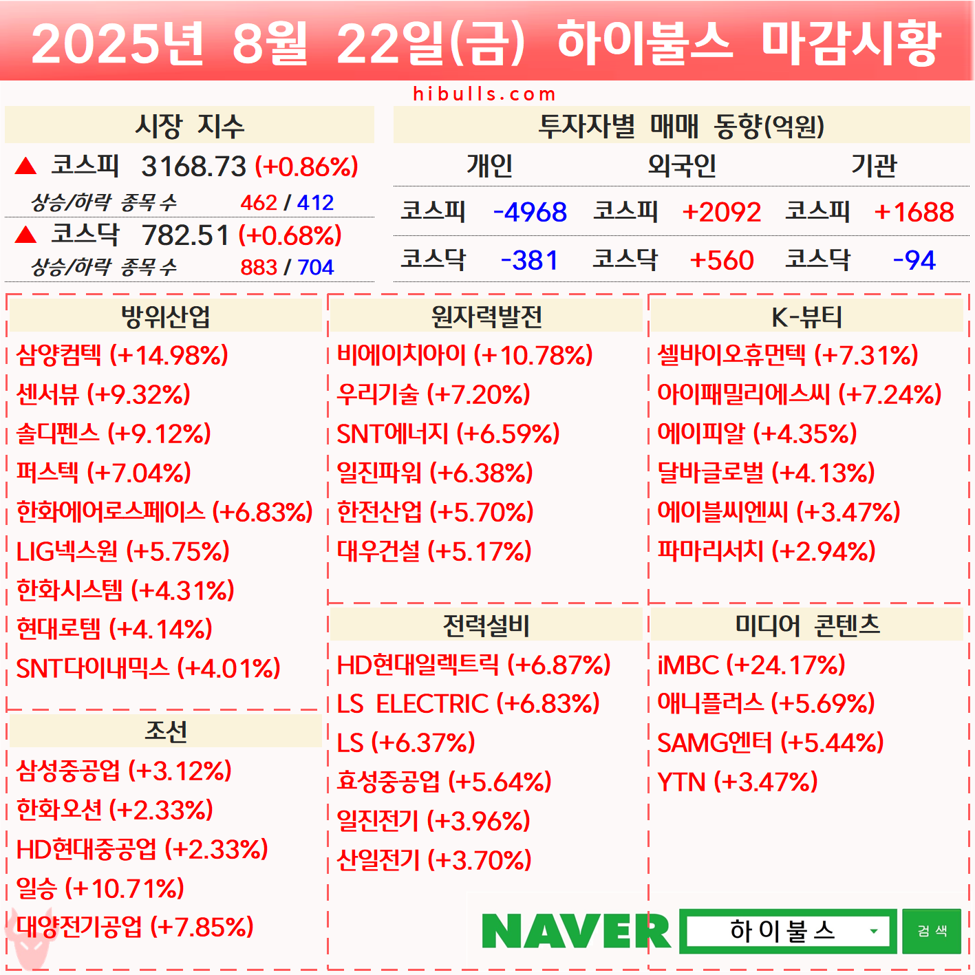 [08.22] 증시 마감시황 및 오늘의 특징주/특징섹터