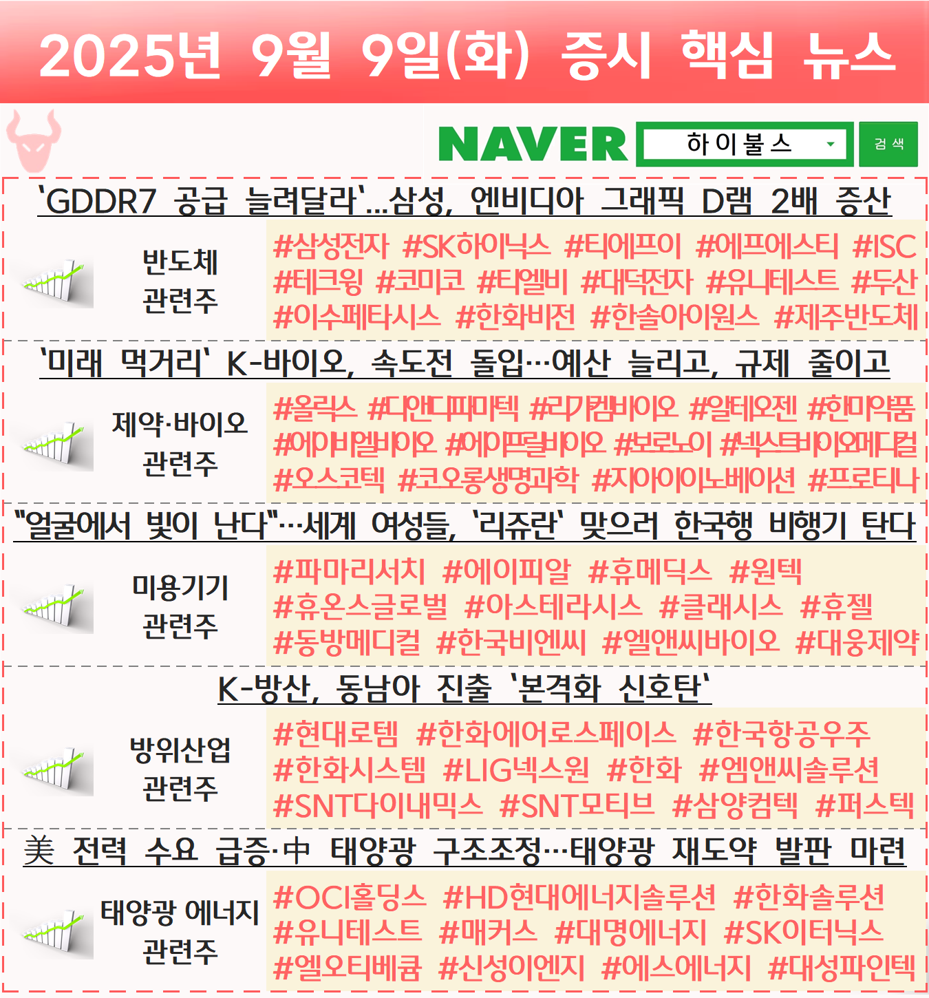 반도체 관련주, 제약 바이오 관련주, 미용기기 관련주, K-뷰티 관련주, 방위산업 관련주, 방산 관련주, 태양광 관련주, 태양광 에너지 관련주 글 내비게이션 [09.08] 증시 개장 전 핵심뉴스 하이불스 Pick [09.10] 증시 개장 전 핵심뉴스 하이불스 Pick