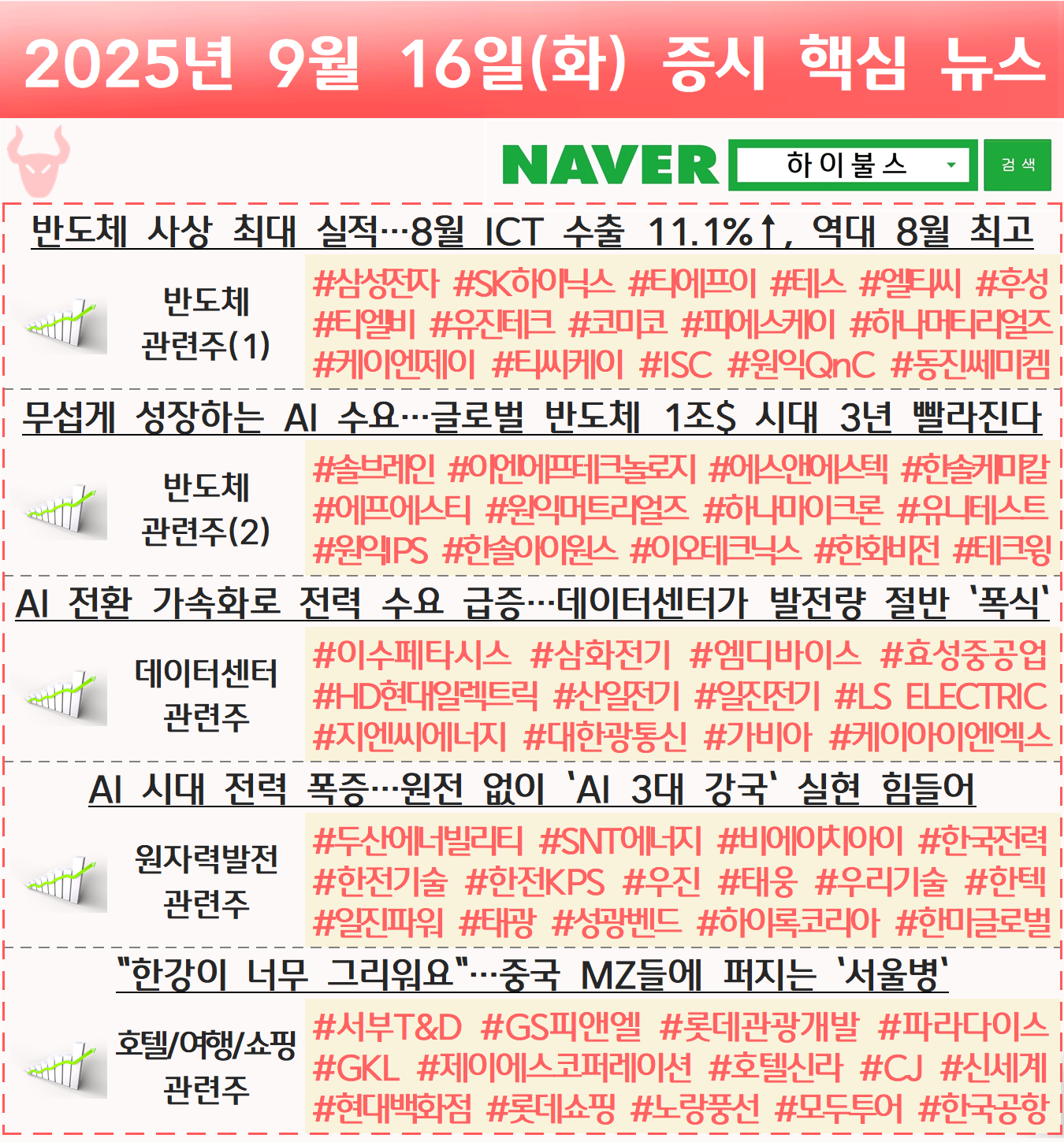 반도체 관련주, AI 반도체 관련주, 데이터센터 관련주, SSD 관련주, 원전 관련주, 원자력발전 관련주, 원자력 에너지 관련주, 호텔 관련주, 여행 관련주, 쇼핑 관련주 글 내비게이션 [09.15] 증시 개장 전 핵심뉴스 하이불스 Pick [09.17] 증시 개장 전 핵심뉴스 하이불스 Pick