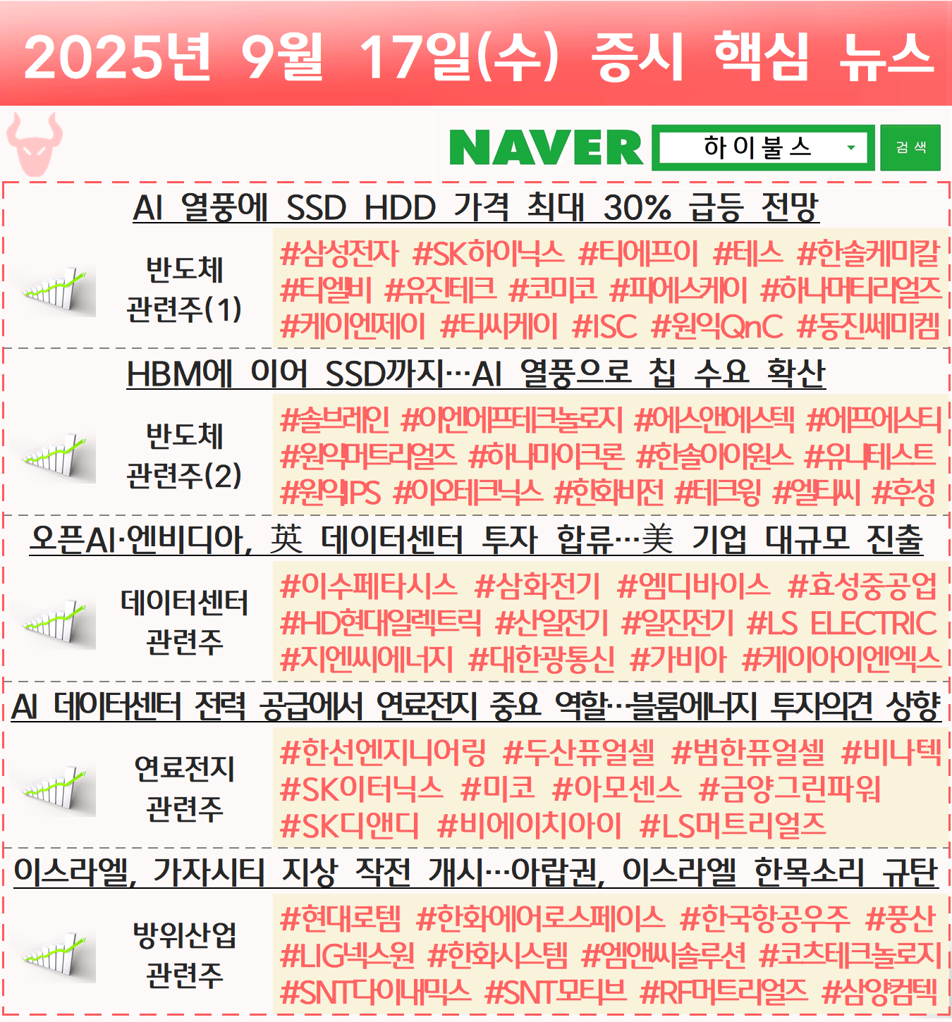 반도체 관련주, SSD 관련주, AI 반도체 관련주, 데이터센터 관련주, 연료전지 관련주, SOFC 관련주, 방산 관련주, 방위산업 관련주, 전쟁 관련주 글 내비게이션 [09.16] 증시 개장 전 핵심뉴스 하이불스 Pick [09.18] 증시 개장 전 핵심뉴스 하이불스 Pick