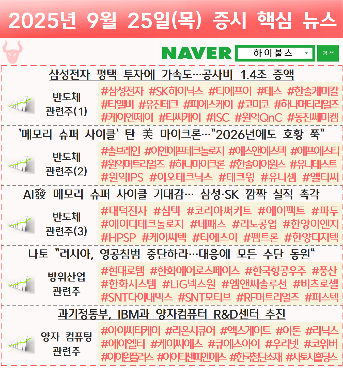 반도체 관련주, 방위산업 관련주, 방산 관련주, 양자 관련주, 양자컴퓨팅 관련주, 양자컴퓨터 관련주, 양자 컴퓨터 관련주, 양자 컴퓨팅 관련주, 양자암호 관련주 글 내비게이션 [09.24] 증시 개장 전 핵심뉴스 하이불스 Pick [09.26] 증시 개장 전 핵심뉴스 하이불스 Pick