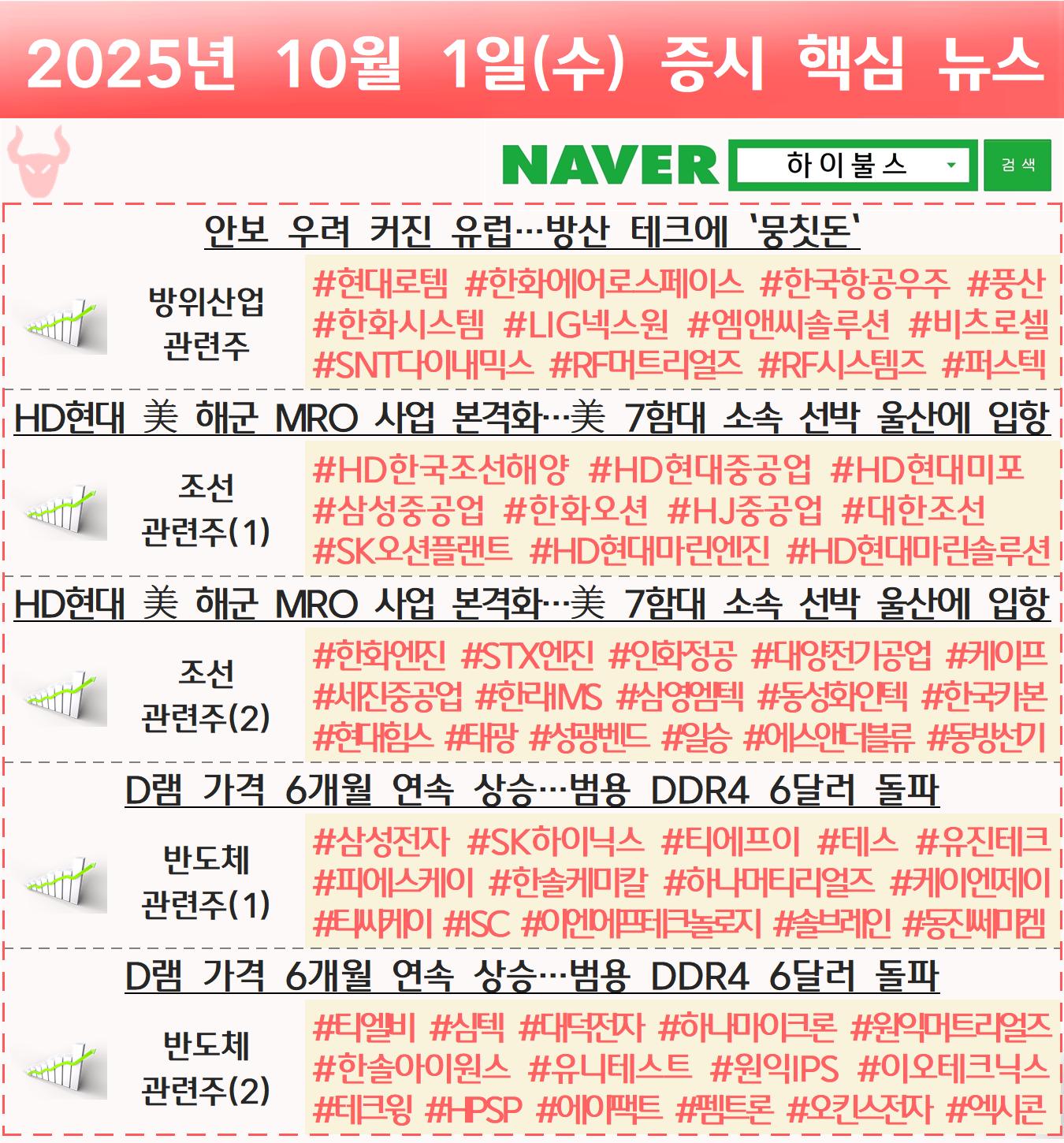방산 관련주, 방위산업 관련주, 조선 관련주, 반도체 관련주 글 내비게이션 [09.30] 증시 개장 전 핵심뉴스 하이불스 Pick [10.02] 증시 개장 전 핵심뉴스 하이불스 Pick