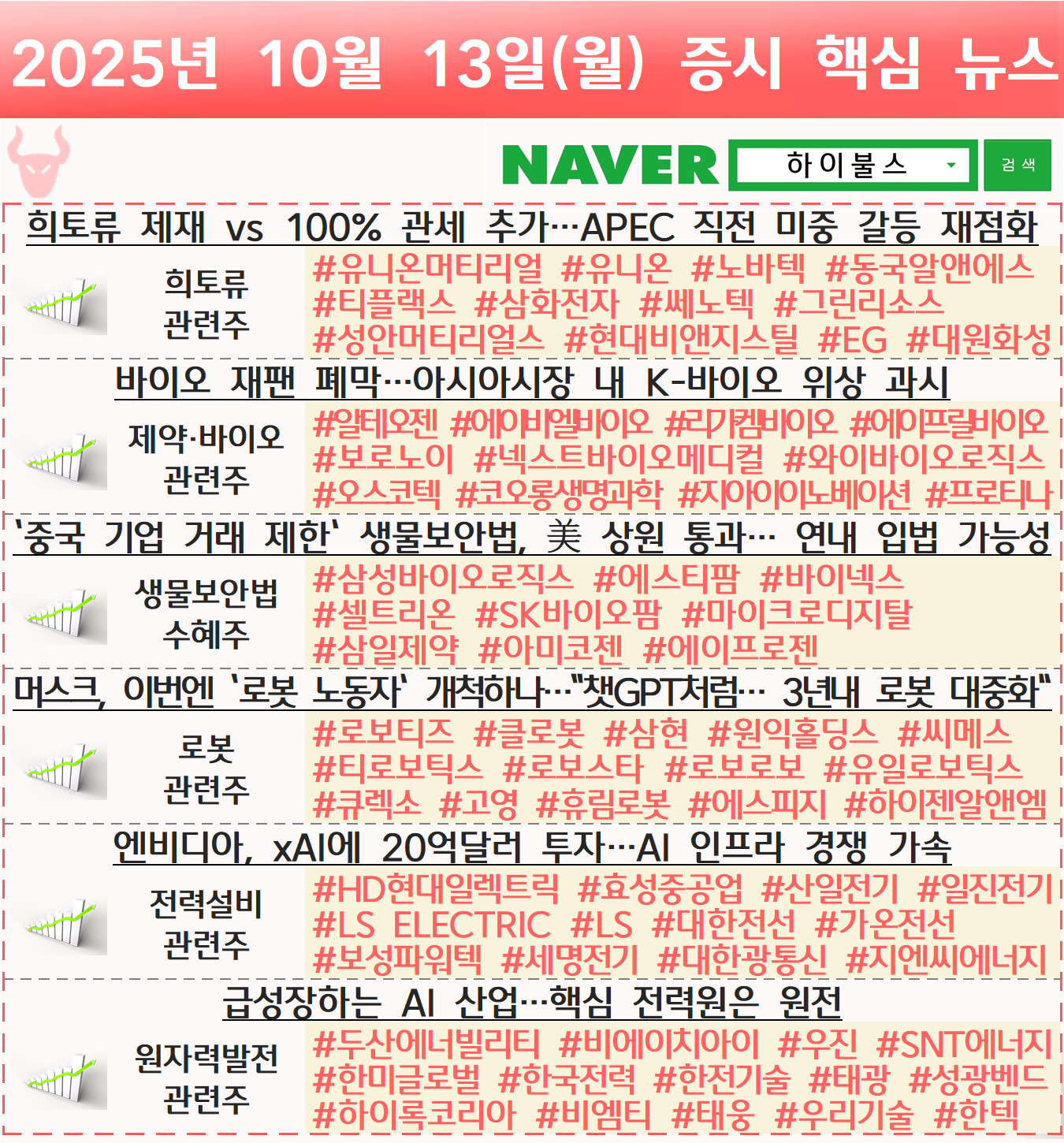 희토류 관련주, 제약 바이오 관련주, 생물보안법 관련주, 생물보안법 수혜주, 로봇 관련주, 휴머노이드 관련주, 전력설비 관련주, 전력망 관련주, 전력기기 관련주, 원전 관련주, 원자력발전 관련주, 원자력 에너지 관련주, 원자력 관련주