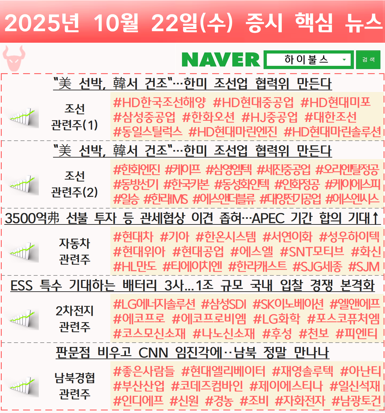 조선 관련주, MASGA 관련주, 마스가 관련주, 자동차 관련주, 2차전지 관련주, 배터리 관련주, 관세 협상 관련주, 남북경협 관련주, 북한 관련주 글 내비게이션 [10.21] 증시 개장 전 핵심뉴스 하이불스 Pick [10.23] 증시 개장 전 핵심뉴스 하이불스 Pick