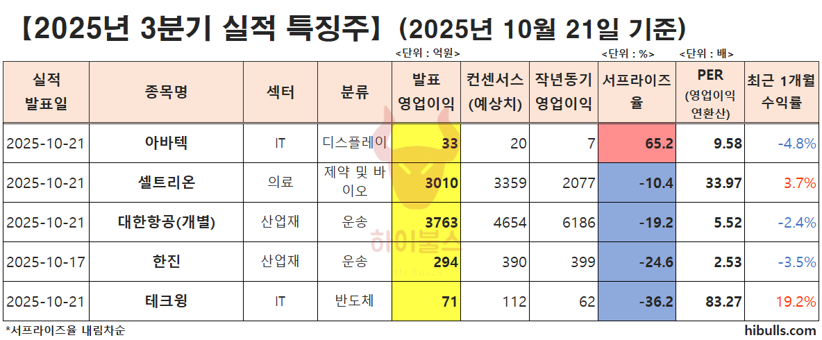 실적 서프라이즈 : 아바텍 실적 미스 : 셀트리온 실적 쇼크 : 대한항공, 한진, 테크윙 글 내비게이션 [10.22] 증시 개장 전 시황&오늘의 대응 전략 [10.22] 종목별 증권사 투자의견 요약