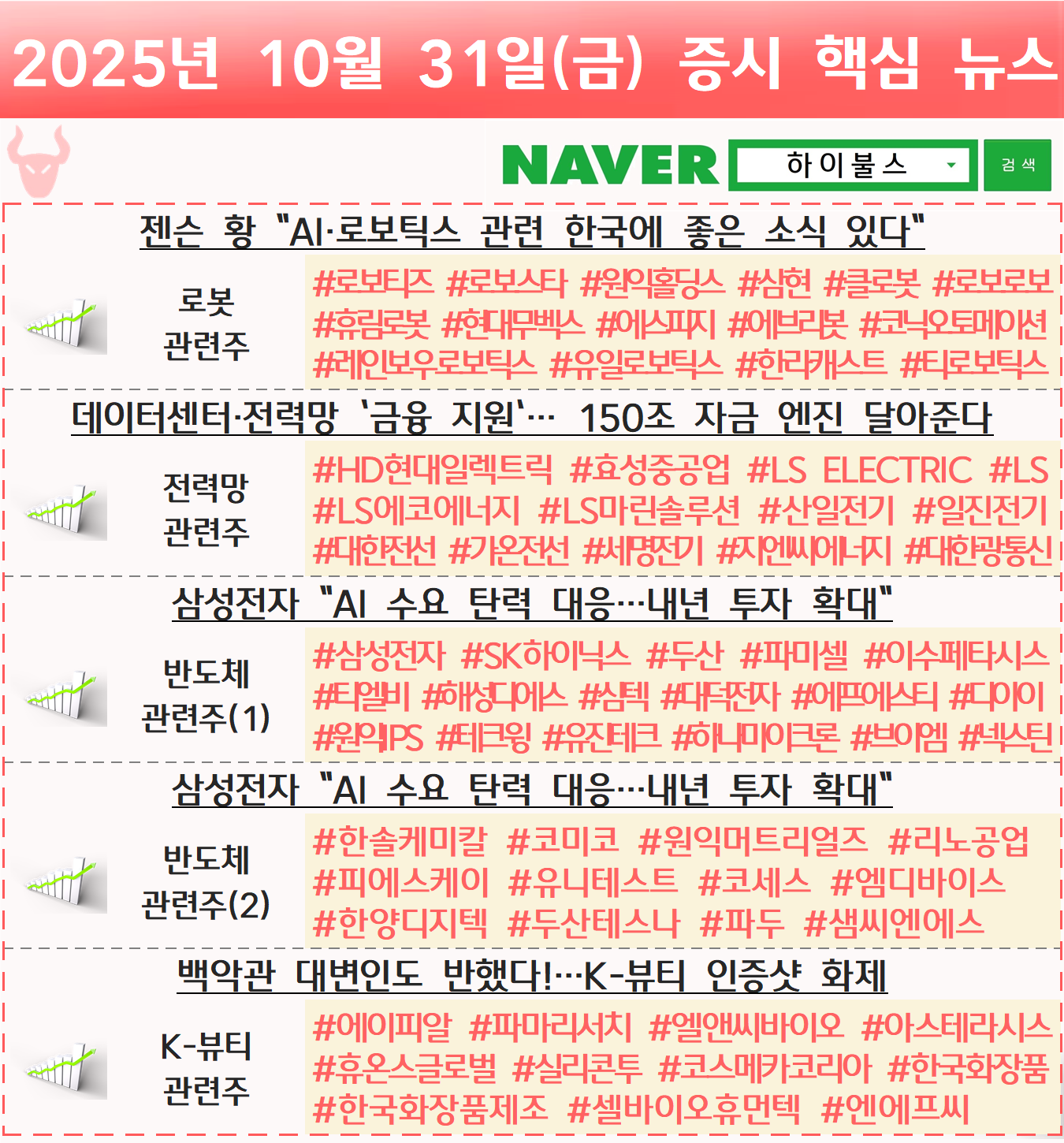 로봇 관련주, 휴머노이드 관련주, 전력망 관련주, 전력기기 관련주, 전력설비 관련주, 반도체 관련주, AI 반도체 관련주, K-뷰티 관련주, K뷰티 관련주 글 내비게이션 [10.30] 증시 개장 전 핵심뉴스 하이불스 Pick [11.03] 증시 개장 전 핵심뉴스 하이불스 Pick