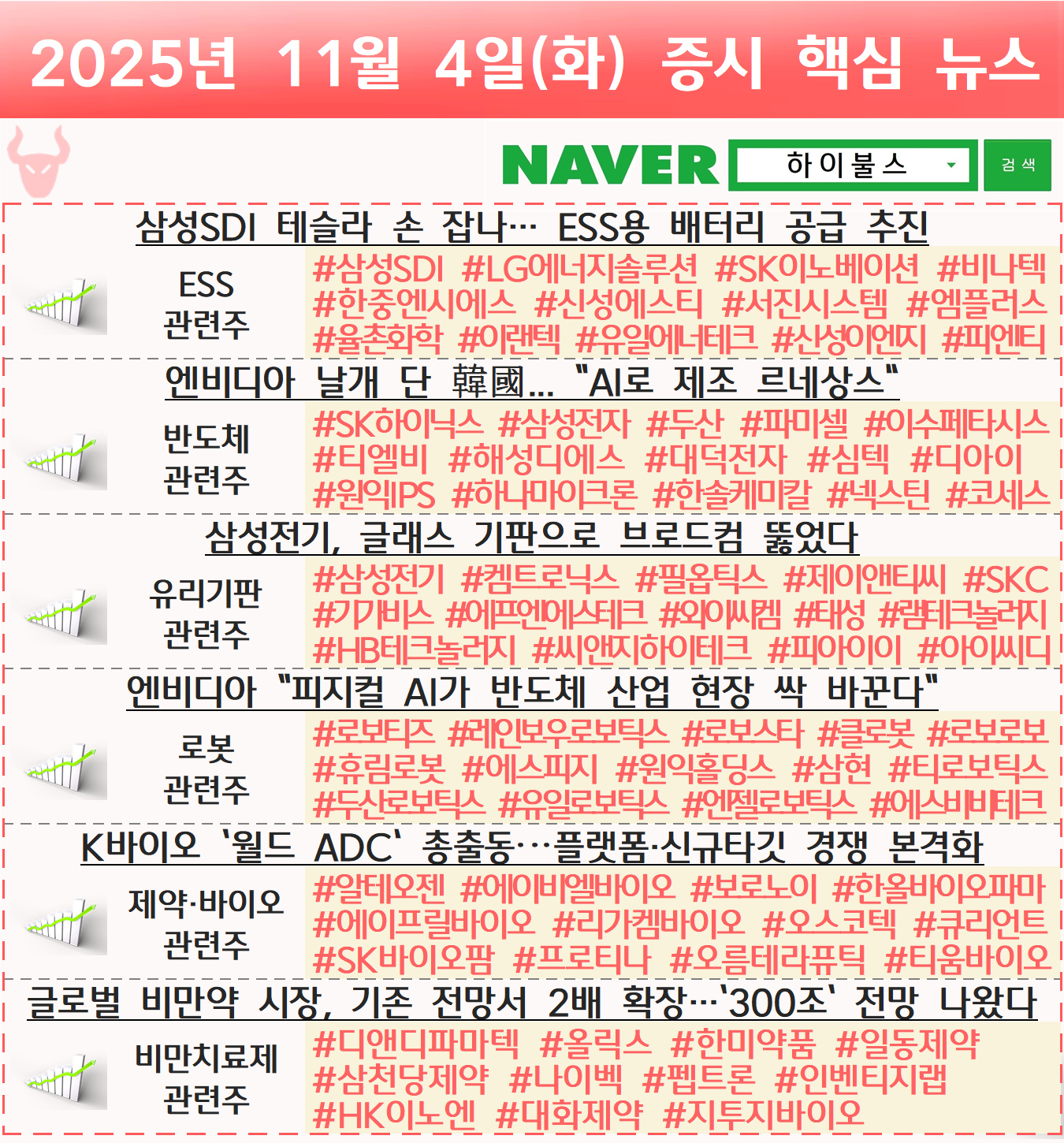ESS 관련주, 반도체 관련주, 유리기판 관련주, 로봇 관련주, 제약 바이오 관련주, 비만 치료제 관련주, 비만치료제 관련주, 비만 관련주 글 내비게이션 [11.03] 증시 개장 전 핵심뉴스 하이불스 Pick [11.05] 증시 개장 전 핵심뉴스 하이불스 Pick
