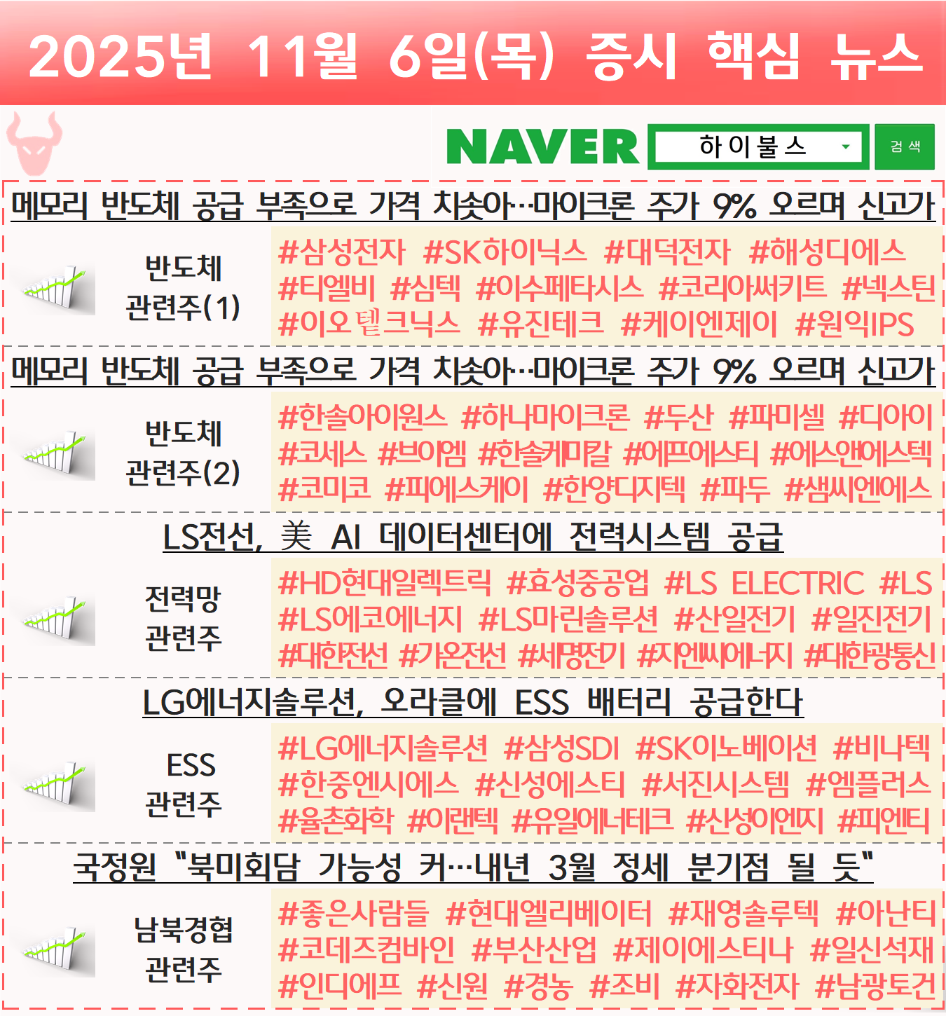 반도체 관련주, 전력망 관련주, 전력설비 관련주, 전력기기 관련주, ESS 관련주, 남북경협 관련주, 북한 관련주 글 내비게이션 [11.05] 증시 개장 전 핵심뉴스 하이불스 Pick [11.07] 증시 개장 전 핵심뉴스 하이불스 Pick